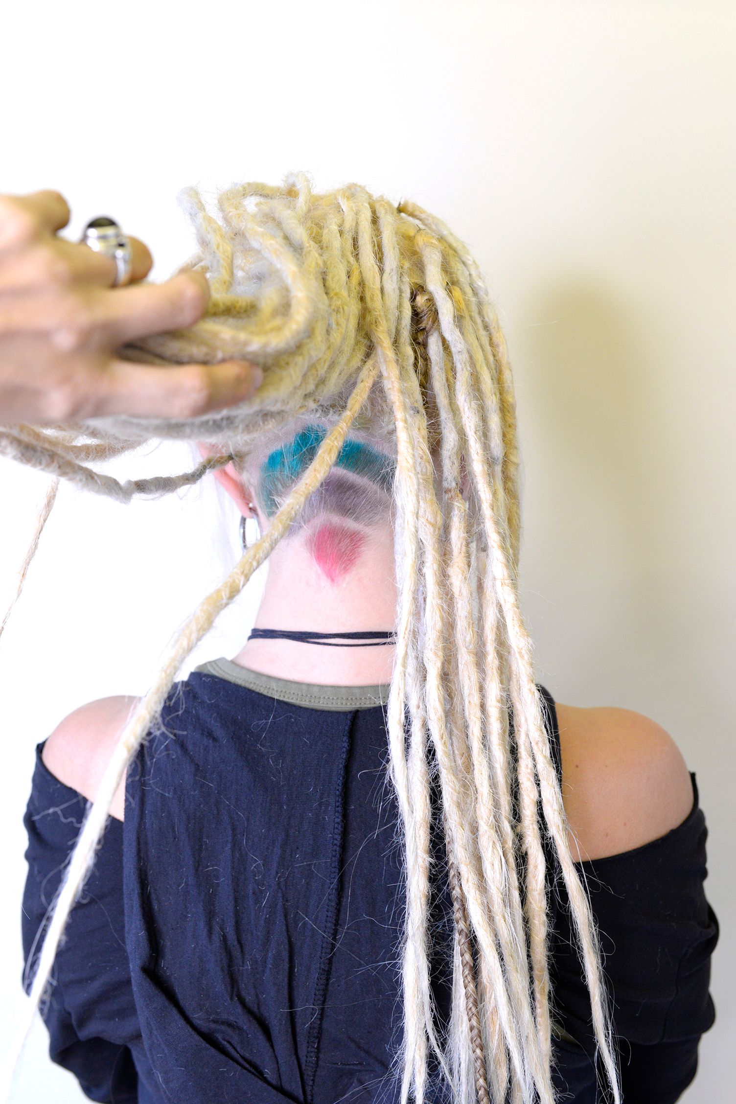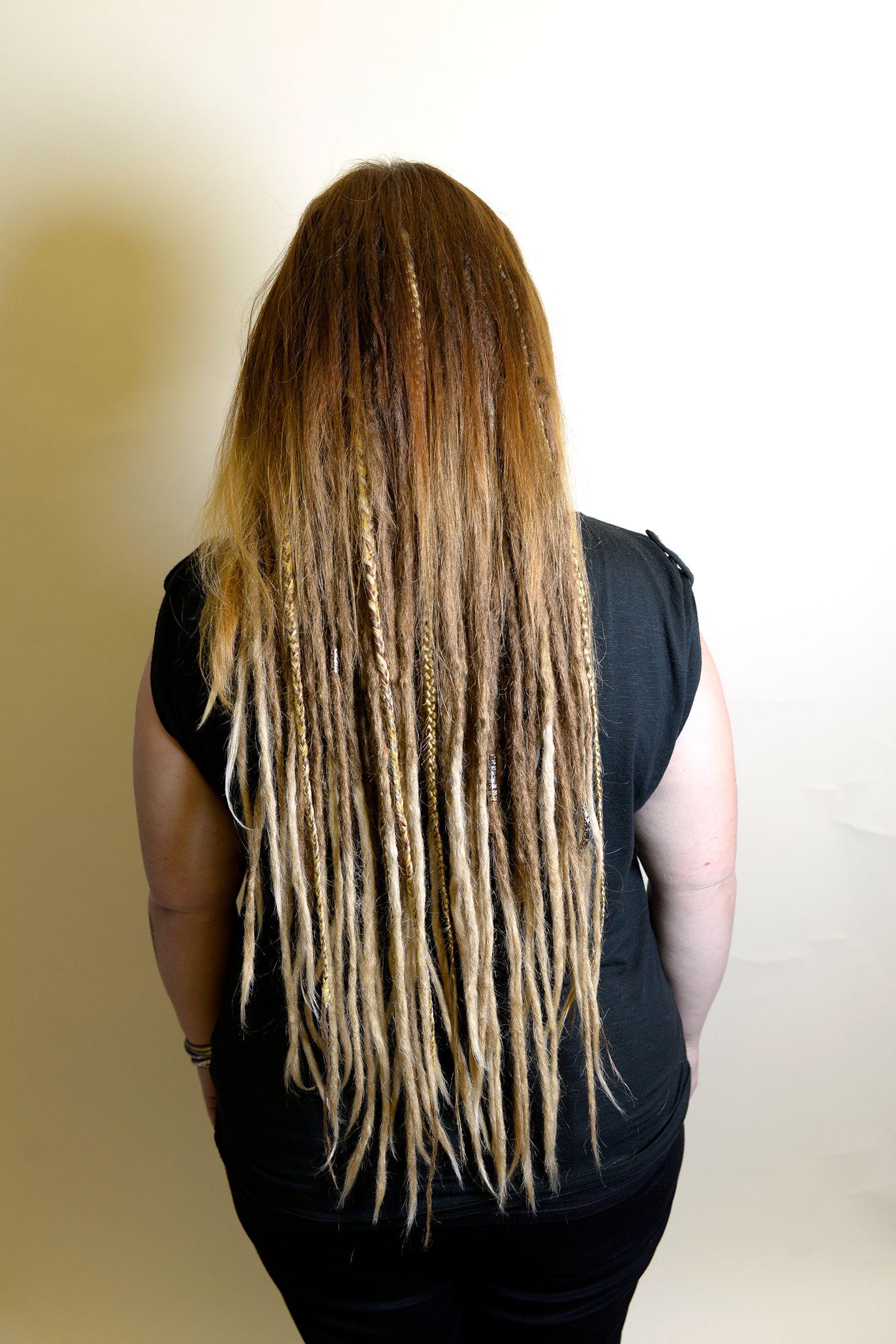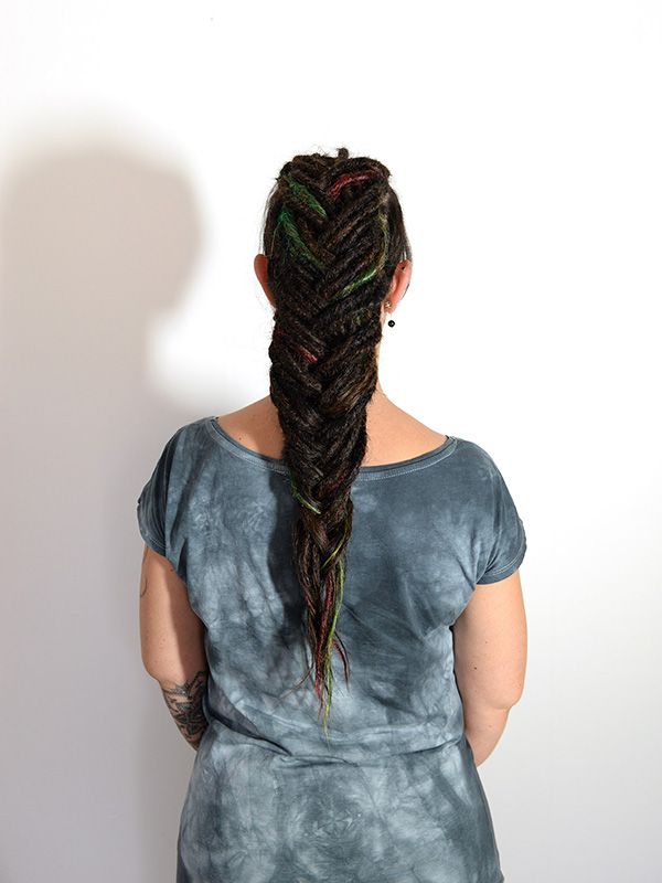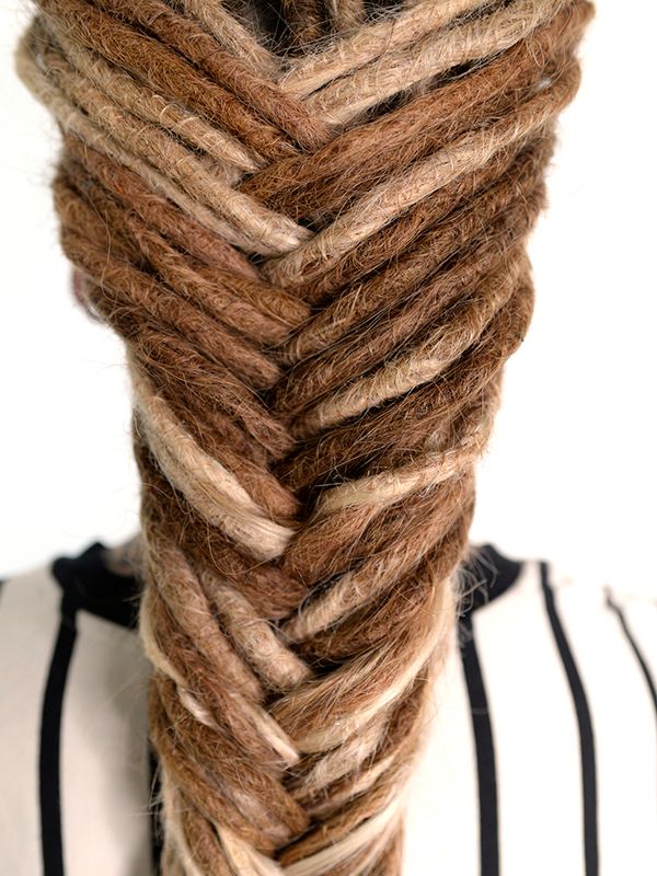 Lorsque j’ai terminé de travailler la dread avec vos propres cheveux, je tisse les extensions de cheveux assorties dans votre chevelure, puis je continue à torsader et crocheter jusqu’à obtenir la longueur désirée.