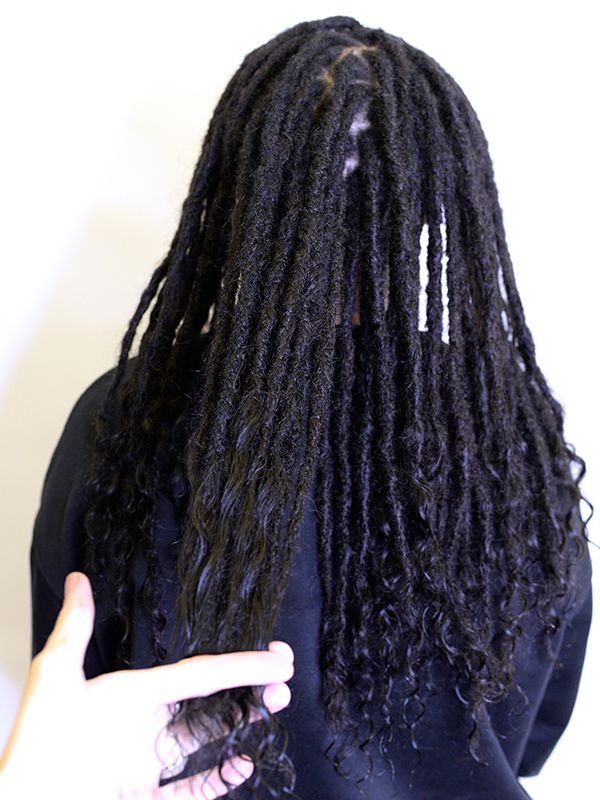 – Si vous ne souhaitez pas de fil à la base, il est possible de choisir une variation où j’utilise quelques mèches d’extensions que je crochète directement avec vos cheveux. Cela permet à vos dreadlocks de mieux tenir et de maturer plus rapidement.